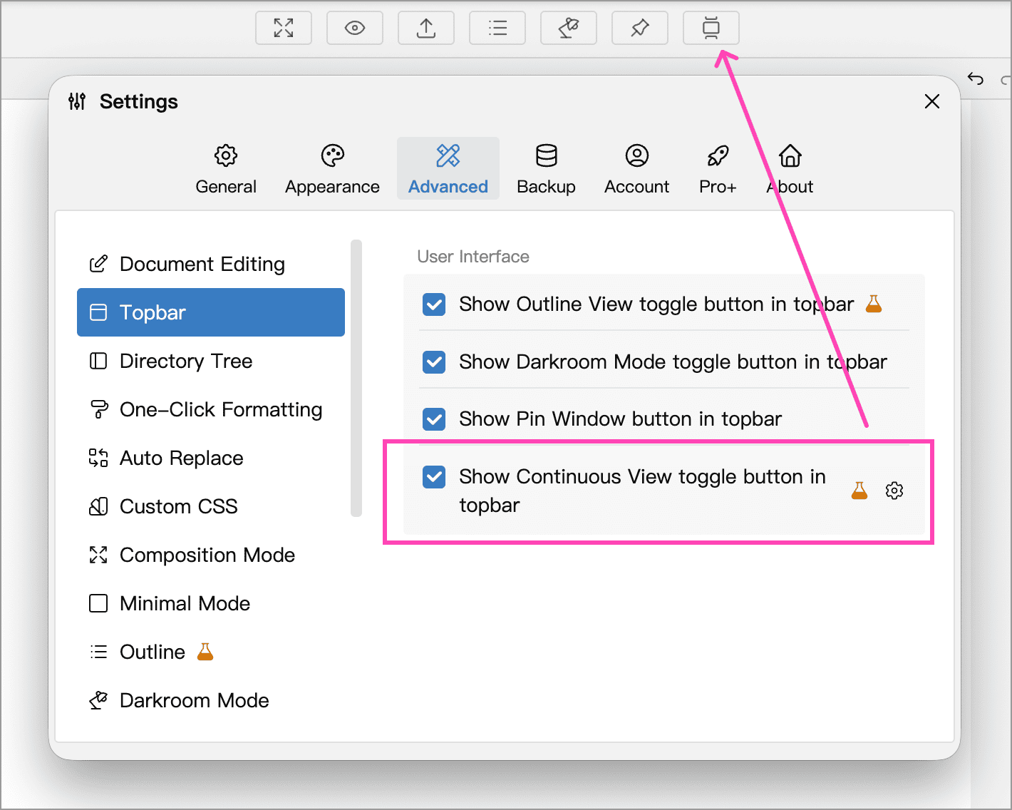 If you’ve enabled the continuous view button in the top bar, click it to enter or exit continuous view. The related setting lives under Settings → Advanced → Top Bar, where you can choose whether to show the continuous view toggle.